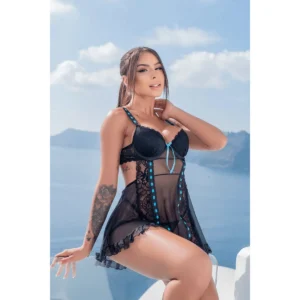 Despierta tu lado más mitológico con esta camisola babydoll que combina la delicadeza del tul negro translúcido con copas de encaje push-up y detalles eléctricos en azul. Ligera como un susurro, seductora como un mito griego, esta pieza fluye sobre tu silueta, revelando justo lo suficiente para hipnotizar.