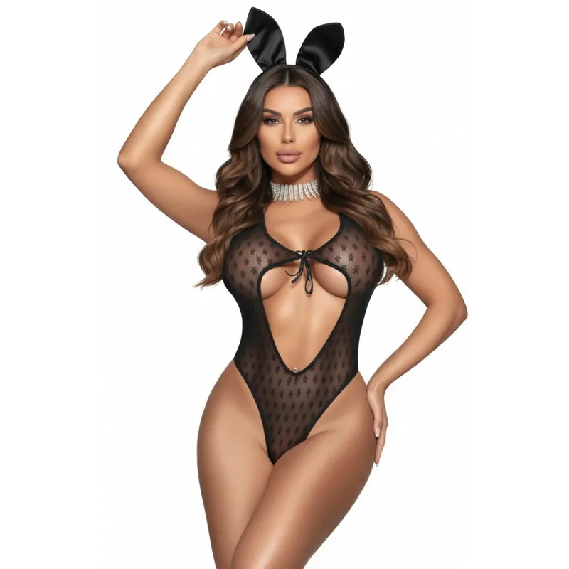 Deslumbra con este body de conejita en tul negro con transparencias y abertura estratégica para momentos intensos. Incluye diadema con orejas para completar tu fantasía. Envío 100% discreto garantizado.