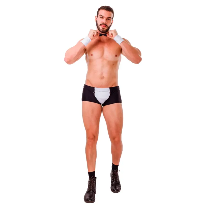 - Seducción Temática: Diseño clásico de barman con un giro atrevido. La sunga negra y blanca está estratégicamente cortada para realzar la figura masculina y provocar.