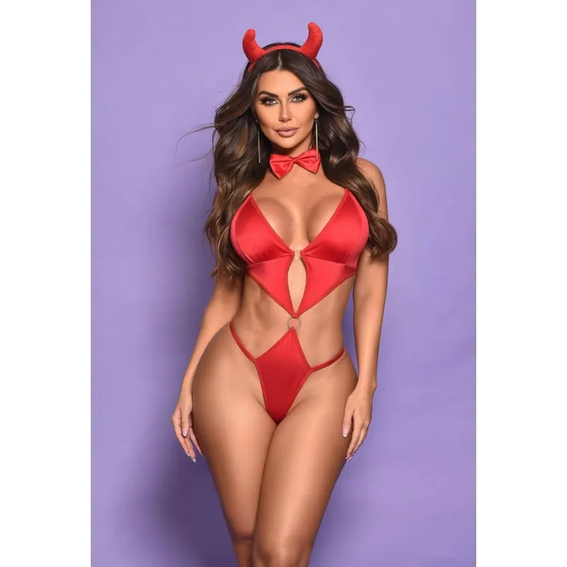 - Set Completo de 3 Piezas: Incluye el body sensual, un corbatín elegante para el cuello y una diadema con cuernos para completar el look de diablita.