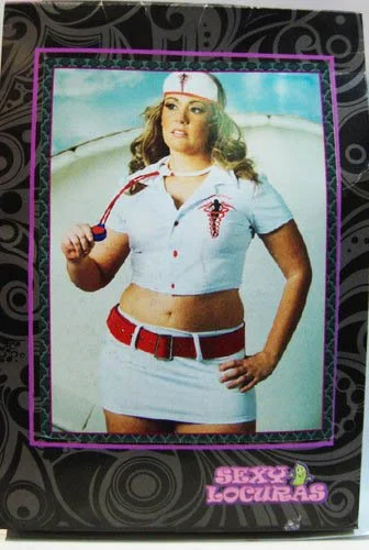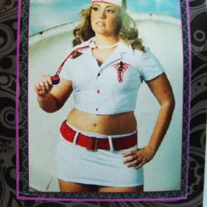 Mini dress, comes with suspenders and interior includes nurse’s cap.