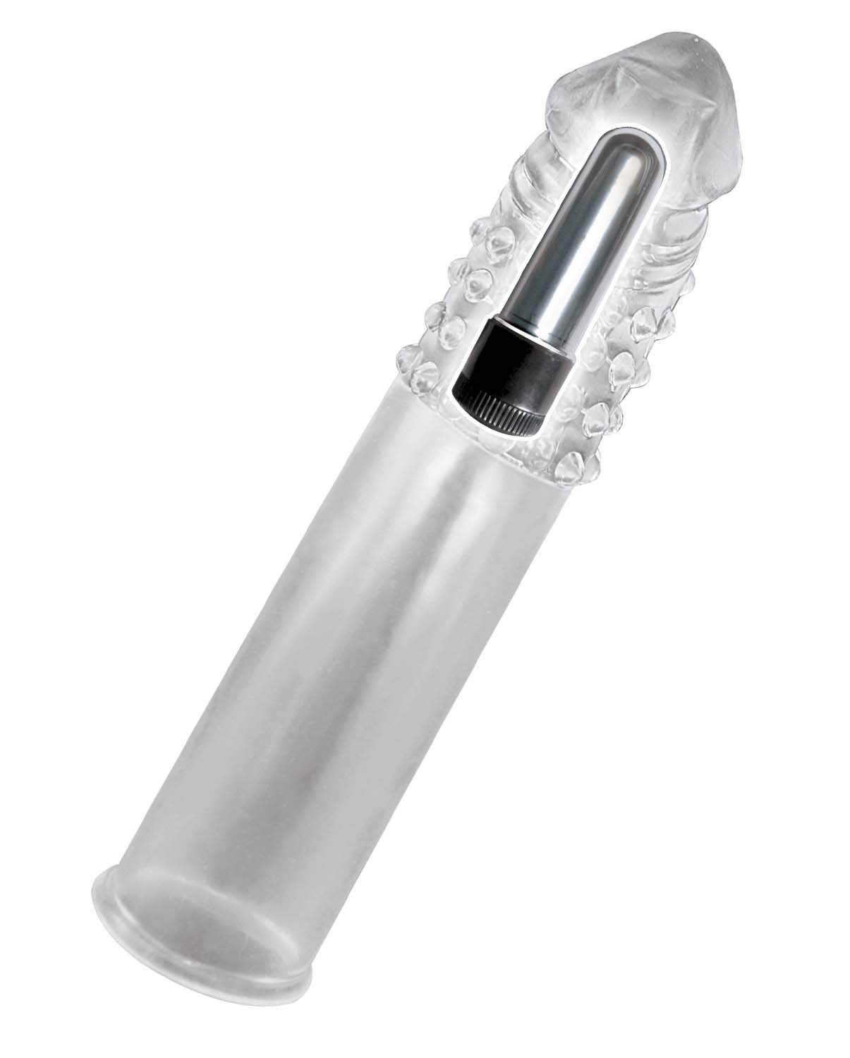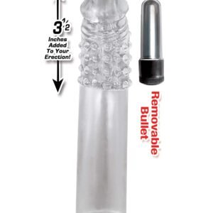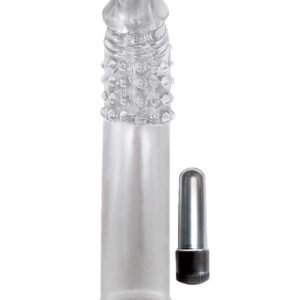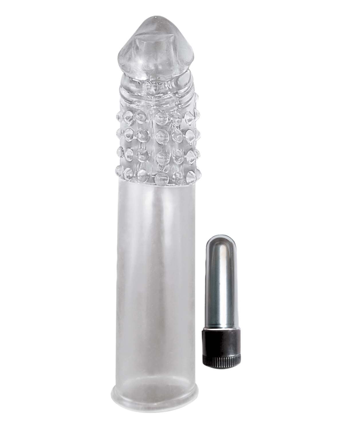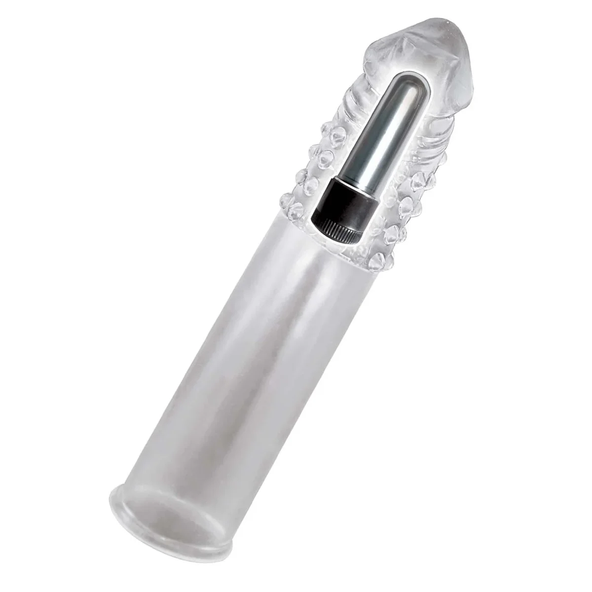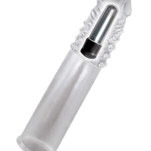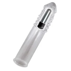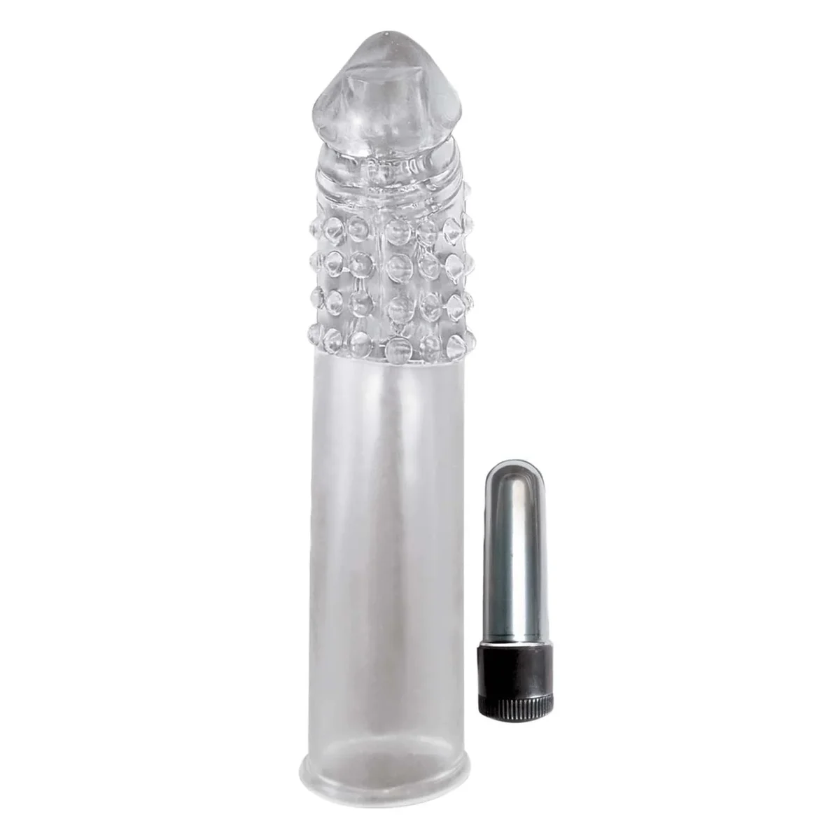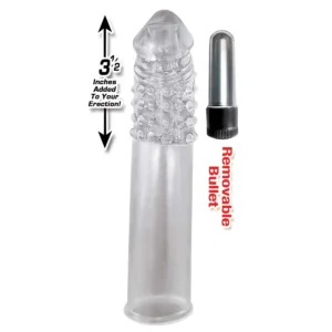 Extensor de pene transparente con textura estimulante y bala vibradora extraíble. Añade 9 cm de longitud y ofrece vibraciones ajustables para mayor placer.